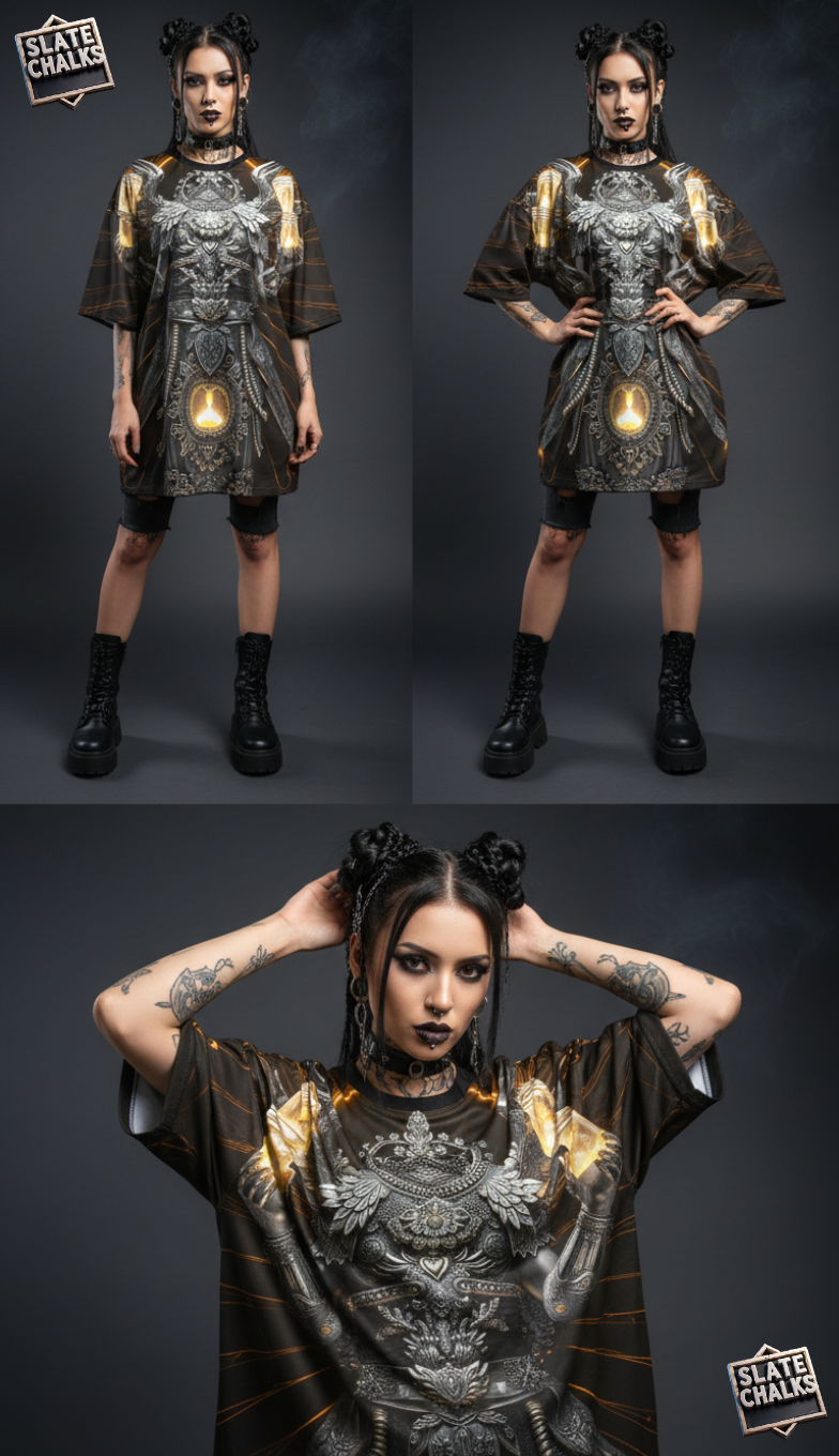 Their ornate garments are woven from the fabric of forgotten centuries — threads of empires, extinct stars, and unborn civilizations stitched together in sacred geometry. Golden neon time-streams spiral from their core, radiating outward in kaleidoscopic precision, touching realities like glowing veins of destiny.