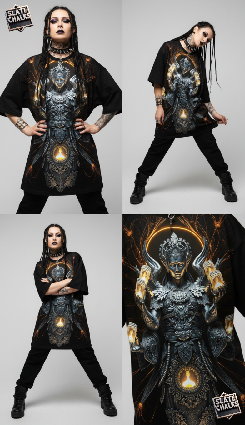 Cast in mirrored grayscale, their form stands in perfect symmetry — not as decoration, but as law. Every movement reflects itself, every gesture echoes across unseen dimensions. Multiple arms extend outward, each holding a luminous hourglass. Yet the sands within do not fall — they rise, dissolve, reverse, and split into branching timelines.